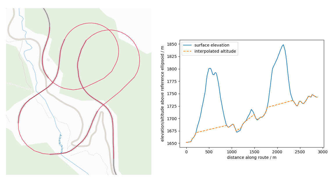 Damit haben wir also alle Komponenten beisammen, um für einen gegebenen Streckenverlauf ein Höhenprofil entlang der verwendeten Infrastruktur des Verkehrsmittels zu erzeugen. In Abbildung 1 ist ein nach dieser Methodik erzeugtes Höhenprofil beispielhaft dargestellt. Wer es selbst einmal ausprobieren möchte, kann dies in unserer Routing-Demo tun: Start und Ziel wählen und dann auf Route information klicken.